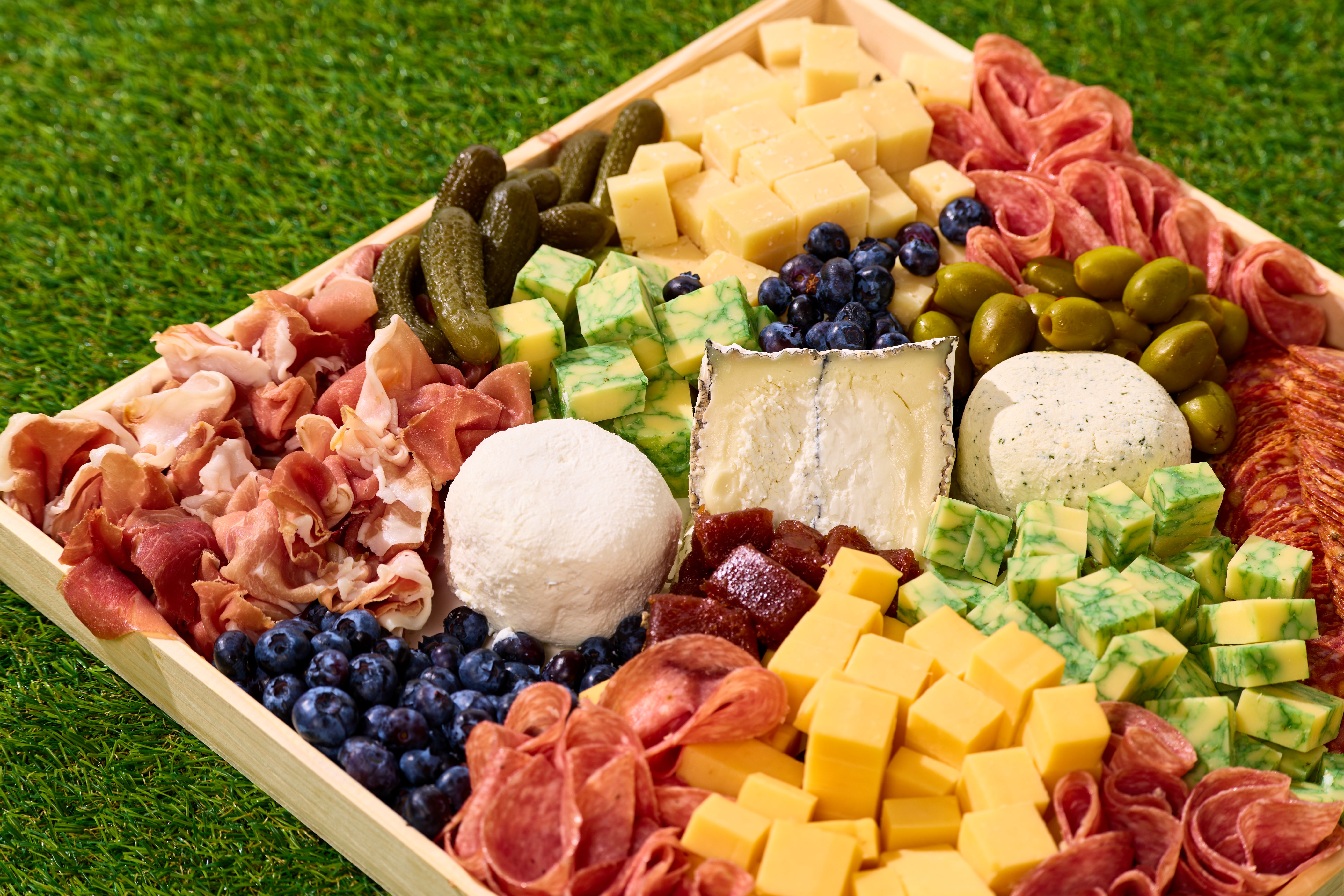 The Artisan Graze Prosciutto Ham, Spanish Chorizo, Giacomo Salami, Humboldt Fog, Sage Derby, Manchego, Van Kaas Gouda, Garnished with Gherkins, Olives, Dried Fruit, Berries, Membrillo, Mrs. Ruth's Jam and Lusty Monk Mustard Served on our Wood Tray with Crackers. Serves 40-60