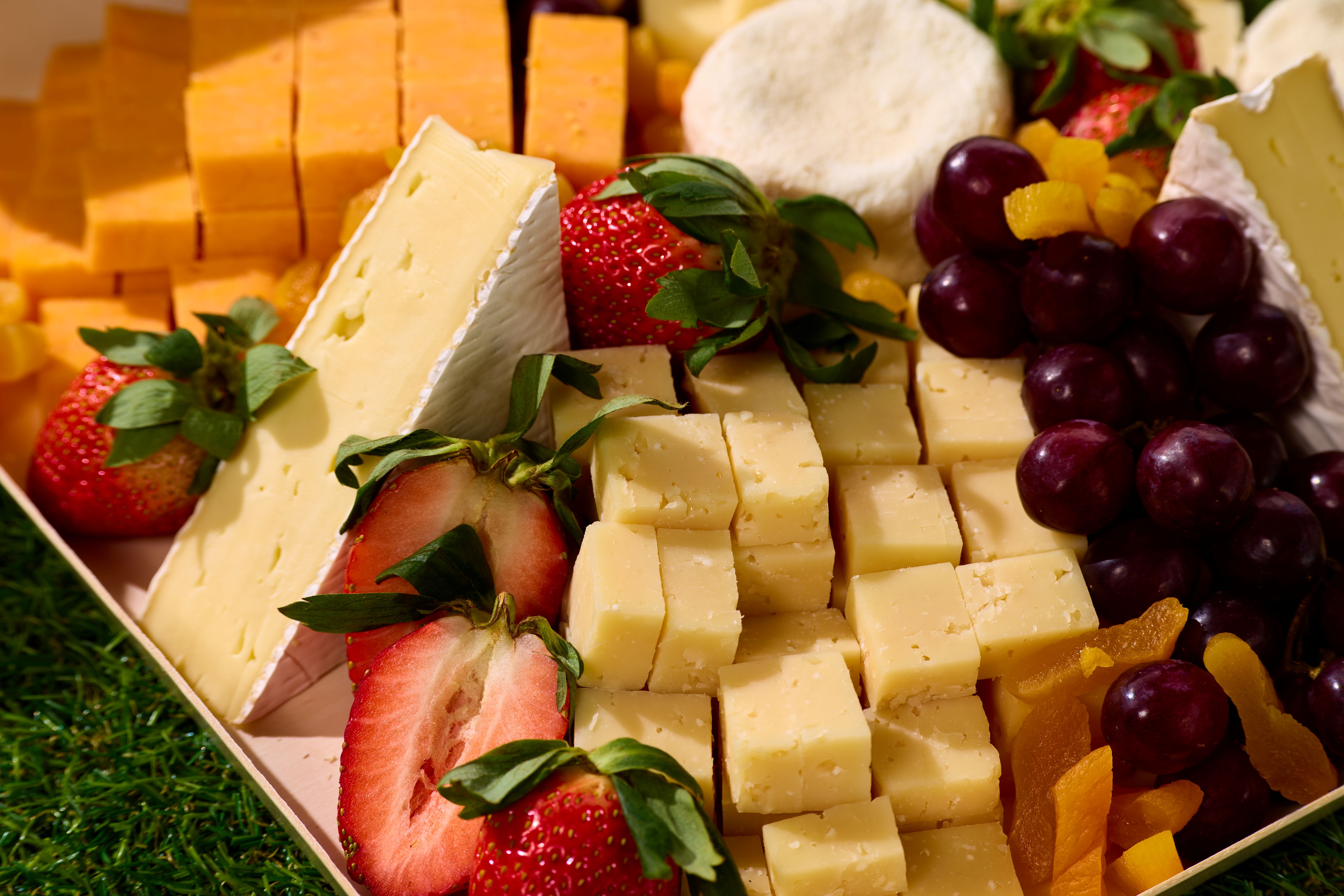 The International Artisan Cheese Board A Variety of Imported and Domestic Cheeses to Include Spanish Manchego, French Brie, NC Ashe County Hoop Cheddar, Creamy Havarti and Chevre. Artfully Displayed on our Balsa Wood Board with Dried and Fresh Fruit Garnish and Crackers. Serves 30-60