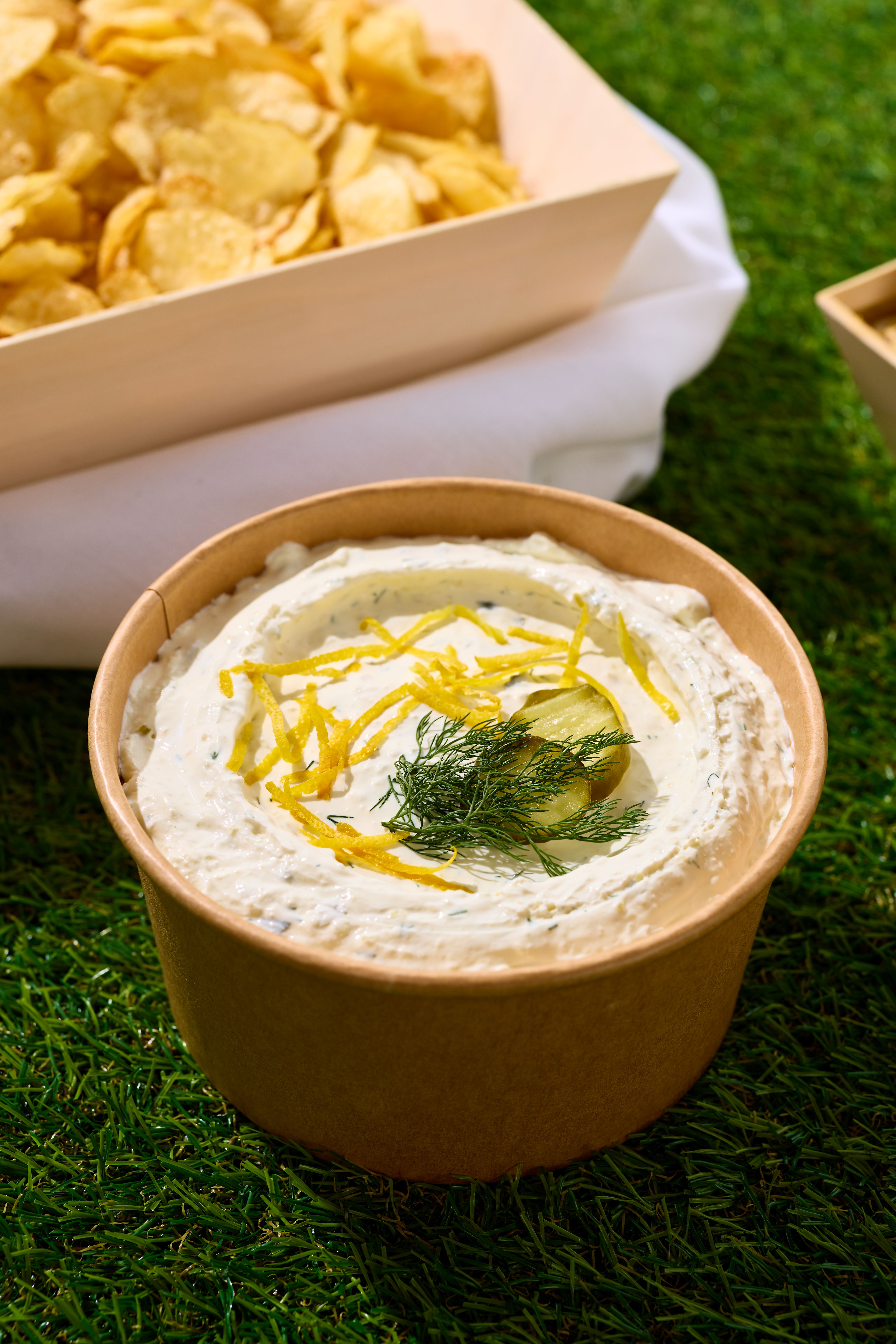 The Kettle and Crunch Tray Crisp Kettle Chips with our Famous Dill Pickle Dip (Gf) (Dip Contains Milk) Served in our Balsa Wood Bowl, Serves 16-30