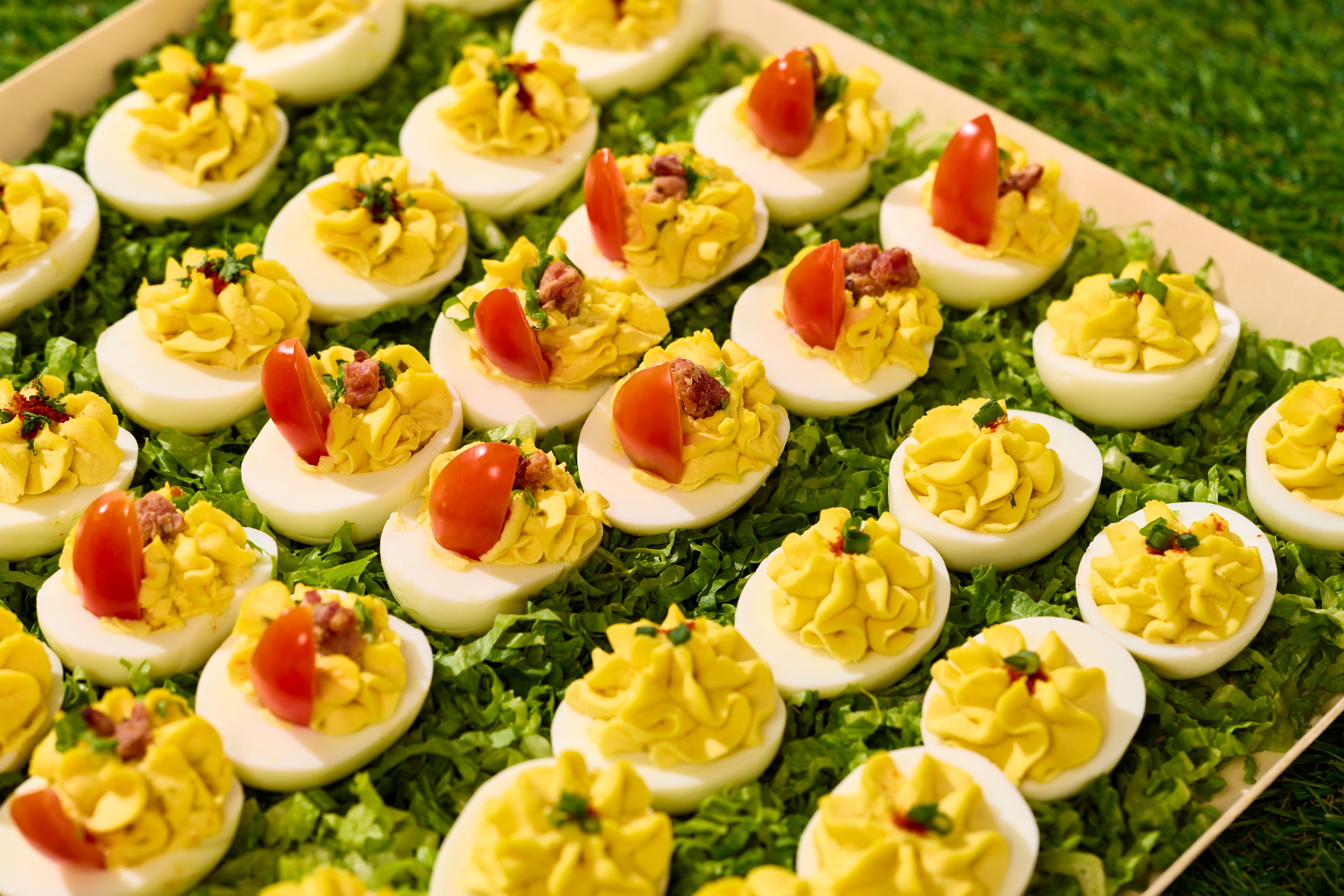 The Picnic Classic Deviled Egg Trio Pick Three of Our Most Popular Deviled Eggs: Sweet & Spicy, BLT, Southern Classic, Everything Bagel, or Bloody Mary. Trayed on Wood Board, Includes (36) Deviled Eggs