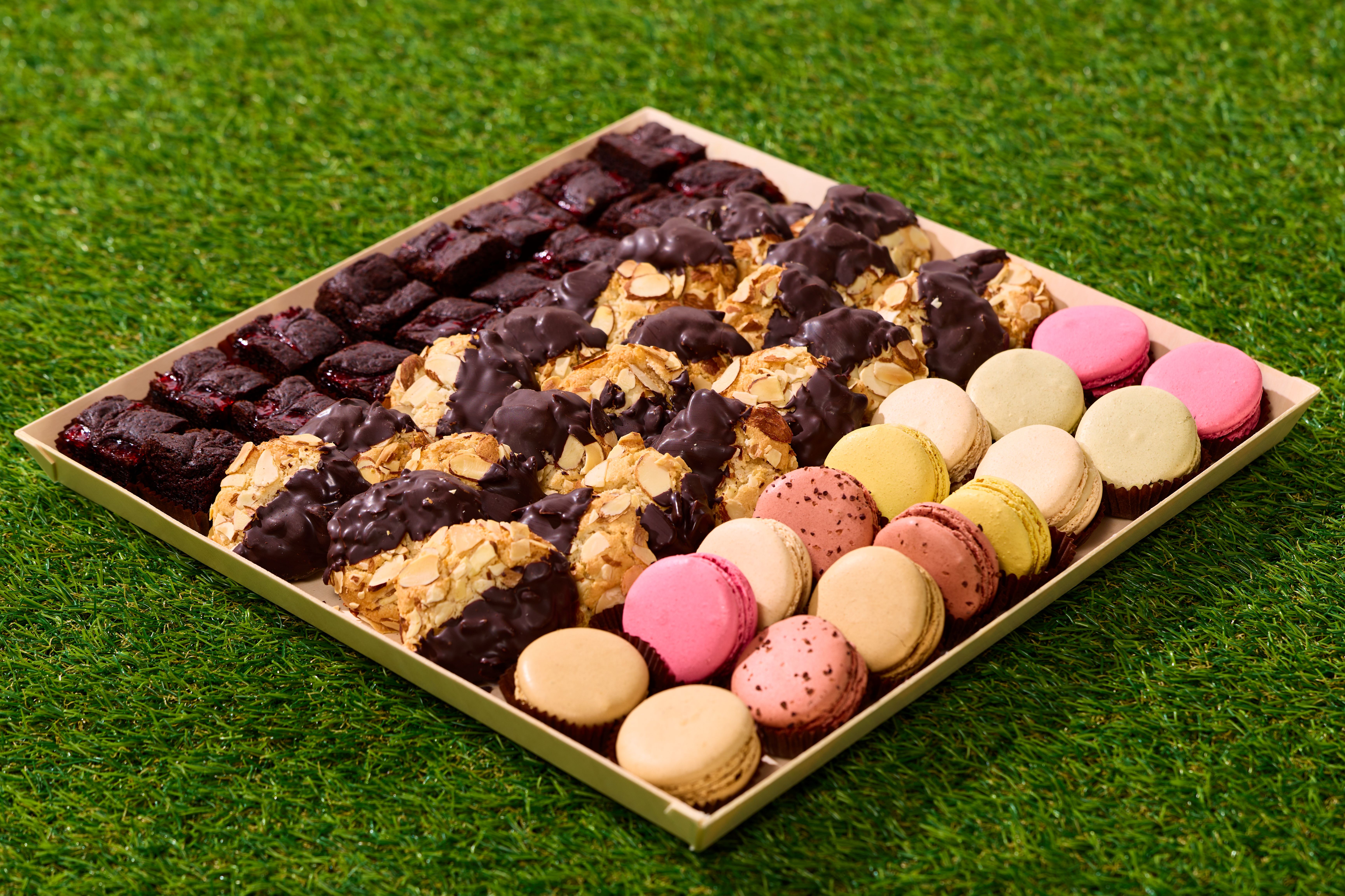 The GF Sweet Spot 16 Raspberry Swirl Vegan and GF Brownie Bites, 24 Almond Coins Dipped in Belgian Chocolate (Contains Tree Nuts-Almonds), 16 French Macarons (Contains Tree Nuts-Almonds) Each board contains 56 pieces