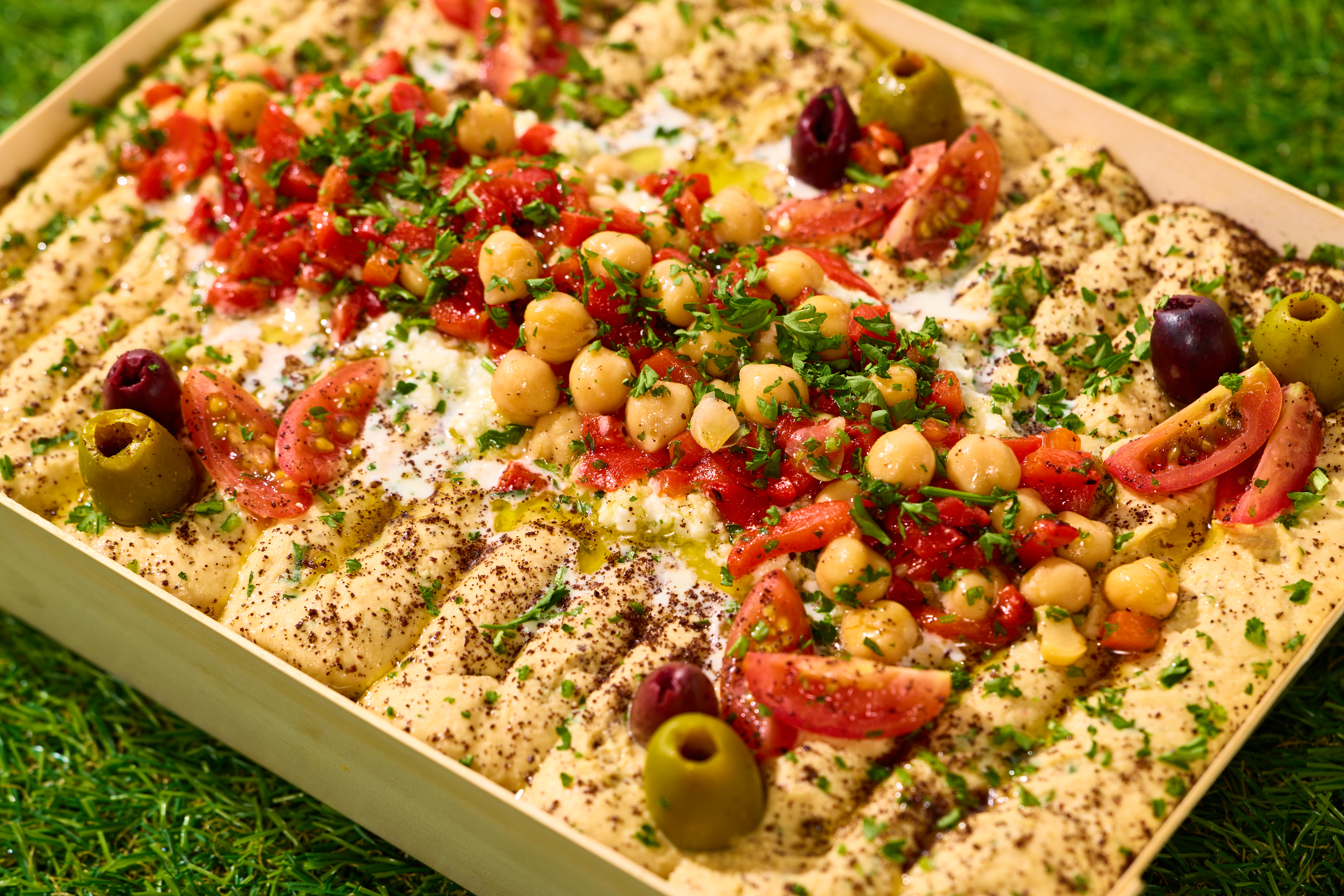 Mediterranean Mezze Bowl Classic Hummus Layered and Topped with Whipped Feta, Greek Olives, Roasted Red Pepper, Grape Tomato, Chickpeas with Sumac, Cayenne, and EVOO Served with Mini Naan and Gluten Free Crackers (Hummus Contains Sesame; Feta Contains Milk; Naan Contains Wheat) Served in our Balsa Wood Collection, Serves 50-75