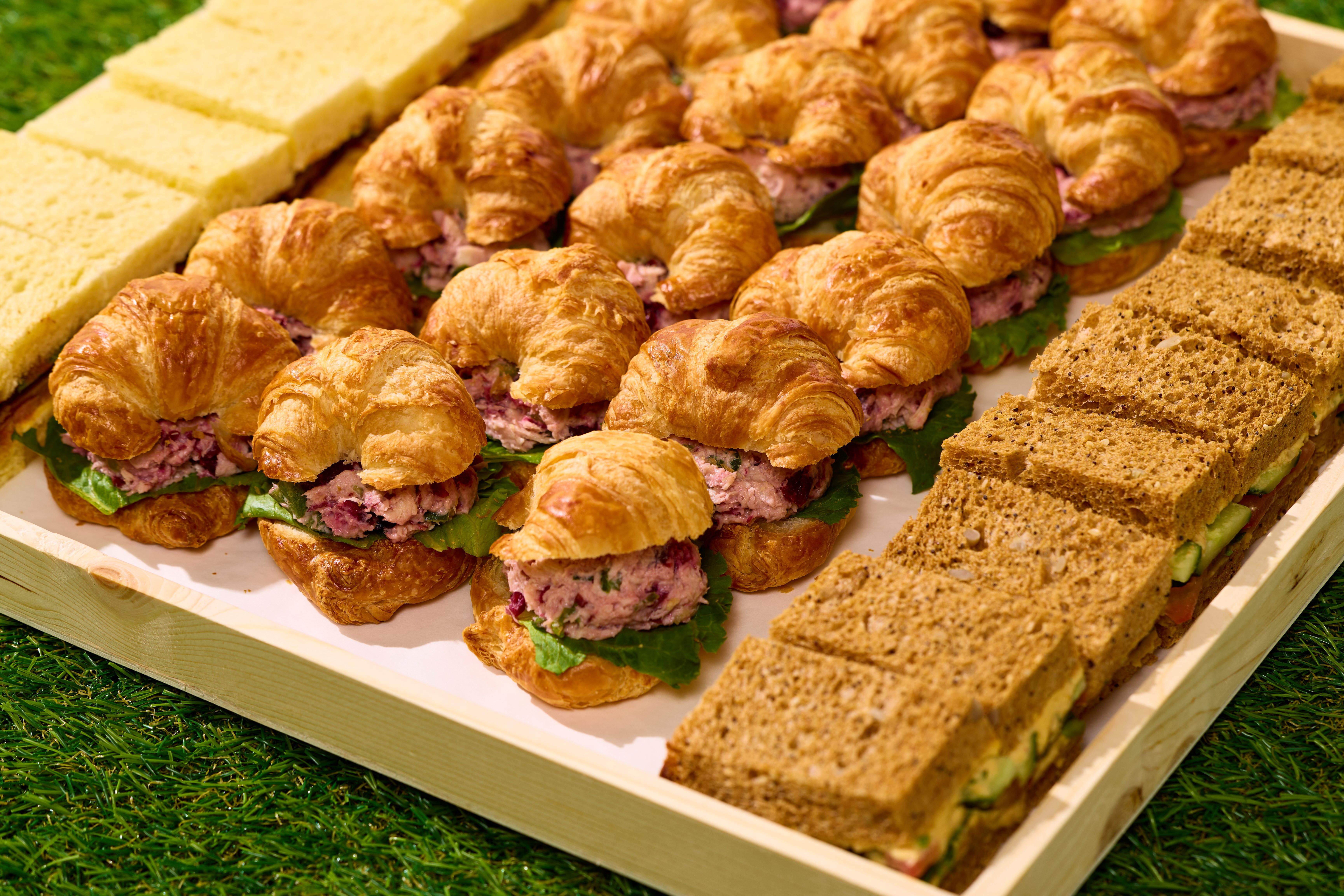 Carolina Tea Board Mini Tarragon Chicken Salad with Grapes and Pecans on Butter Croissant (18), Pimento Cheese on Vienna White Bread (9) and Cucumber on Dual Tone Bread with Elderflower and Cream Cheese (9) Displayed on our Wood Board, Includes (36) Tea Sandwiches