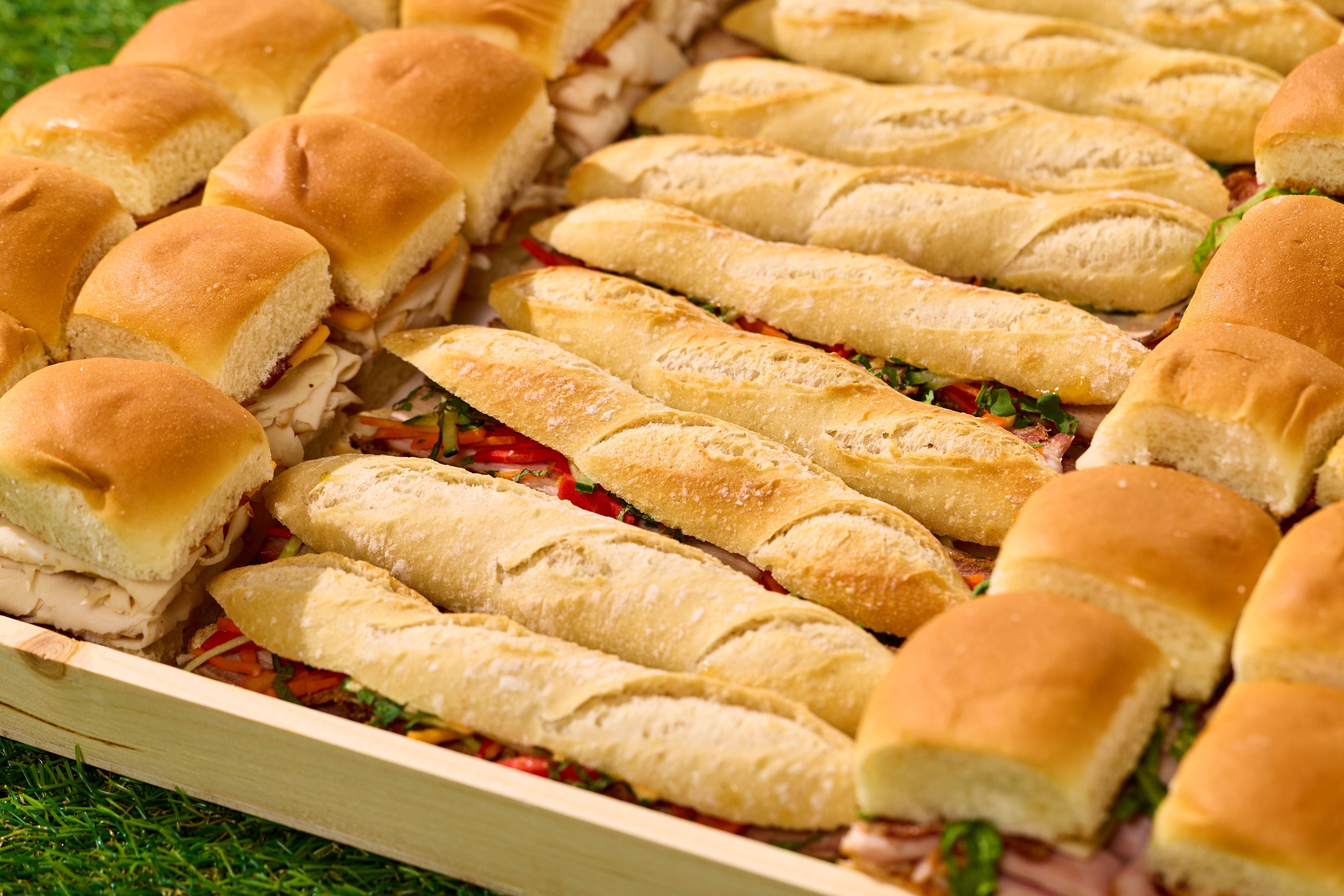 Oak City Slider Board Three of our Signature Sliders : Roasted Pork Bahn Mi on Petite Baguette (10), Roasted Chicken with Caramelized Onion & Cheddar on Hawaiian Roll (14) and Turkey & Ham Club on Hawaiian Roll (14) Served on our Solid Wood Tray, Includes (38) Sliders