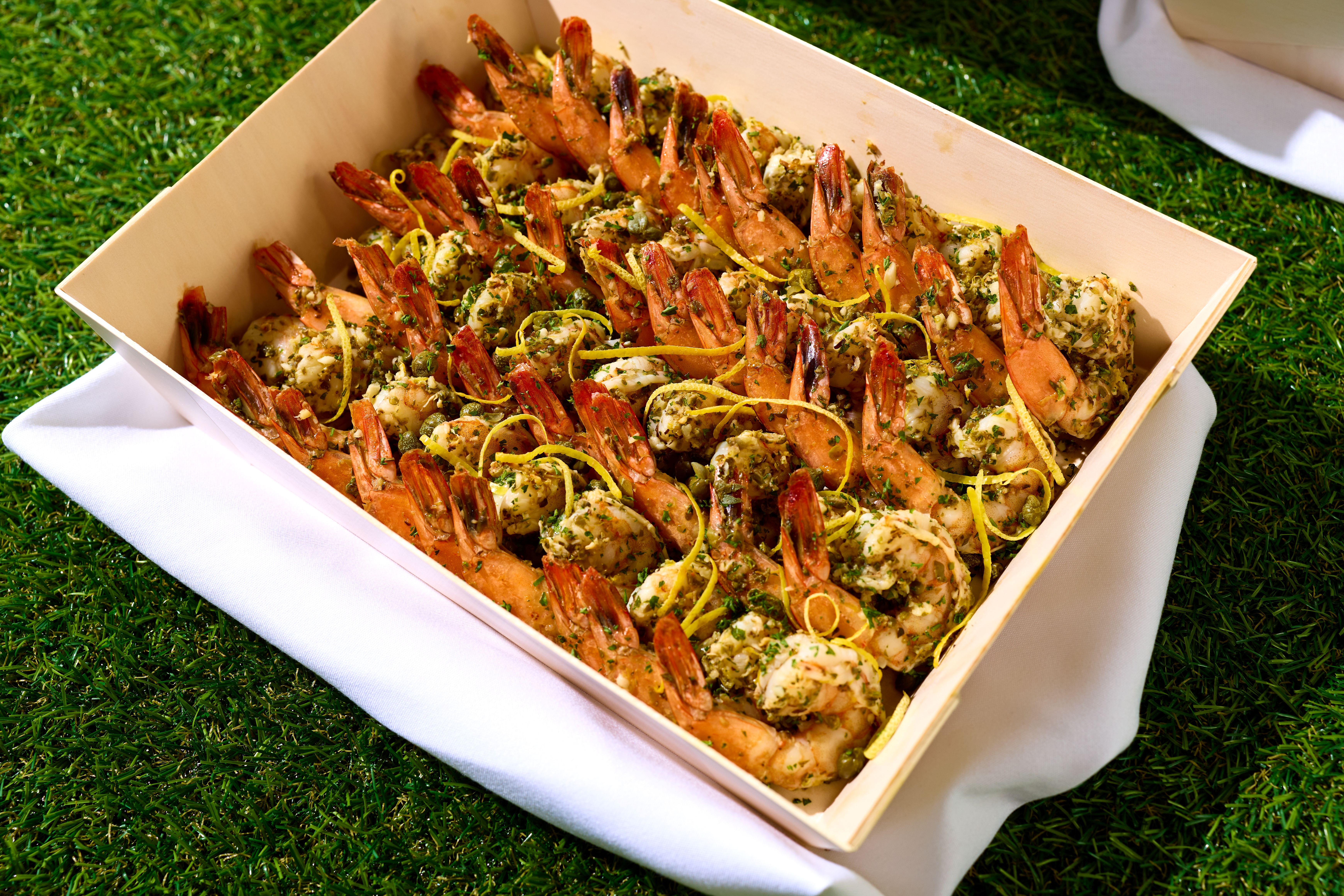The Aegean Shrimp Bowl Jumbo Shrimp with Lemon, Oregano, Capers and Olive Oil. Served in our Balsa Wood Bowl, contains (48) Shrimp