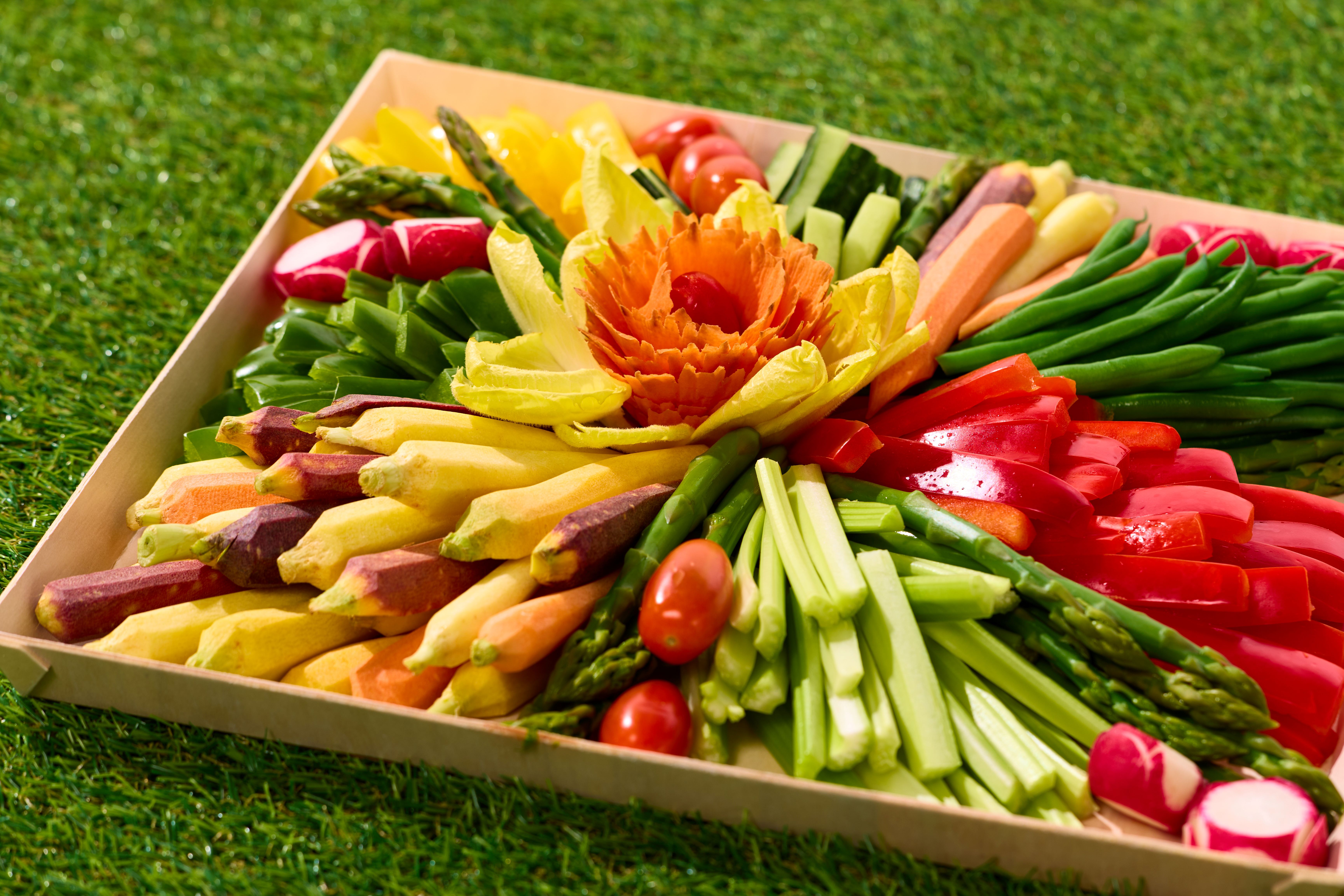 The Garden Grazing Board Crisp, Colorful Garden Vegetables with our House Made Creamy Green Goddess Dip Artistically Displayed on our Balsa Wood Board, serves up to 50-75